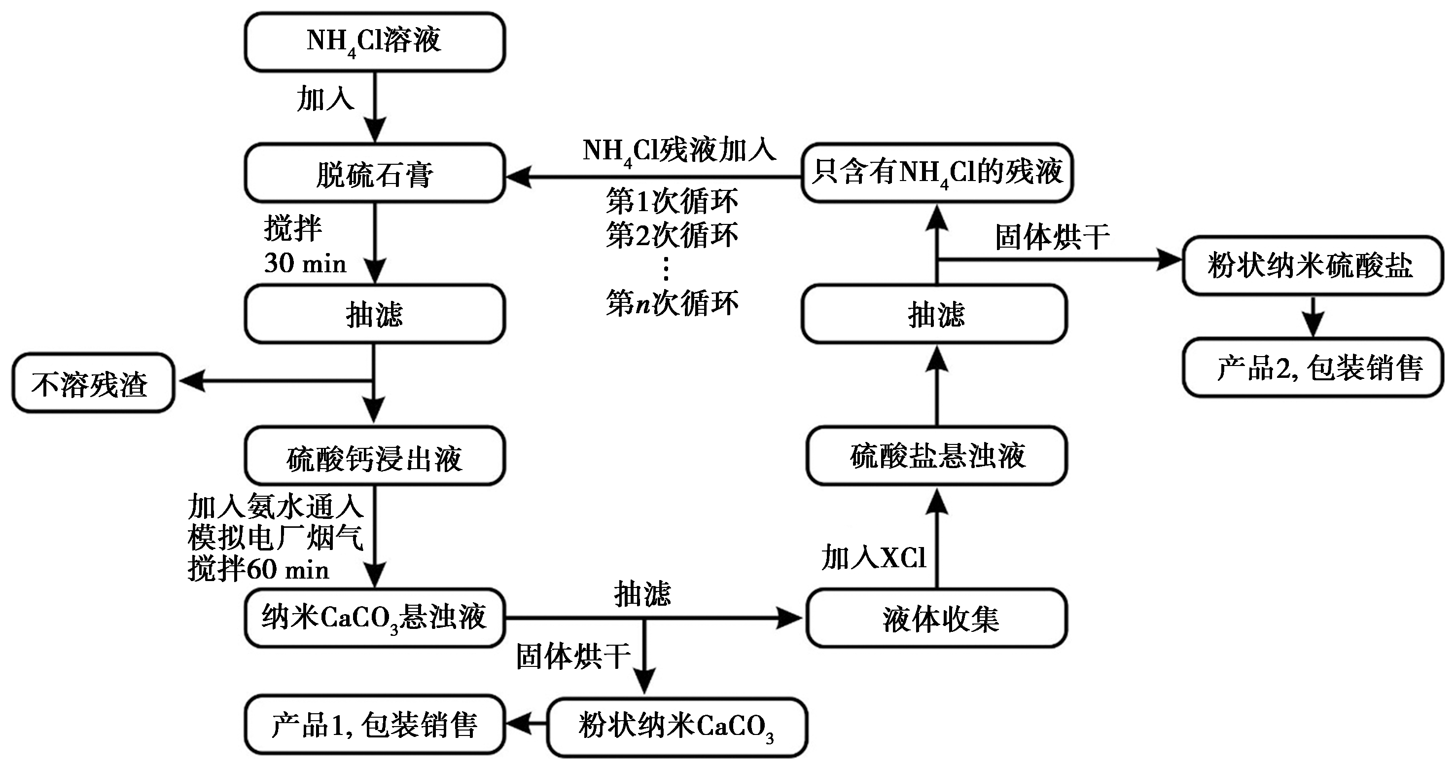 以鹤壁某燃用高硫煤电厂产生的脱硫石膏为原料,通过氯化铵盐溶液溶解脱硫石膏,在石膏浸出滤液中加入氨水,通入模拟电厂烟气制备微纳米CaCO3。在提取过Ca2+的滤液中加入金属氯化物与SO2-4结合,形成微纳米XSO4沉淀。实验结束后,残余液体仍然为氯化铵溶液,且可循环用于下一次浸出。利用XRD和SEM对样品进行测试。结果表明,制备的碳酸钙是球霰石和方解石的混合晶体,晶粒尺寸为微纳米级,纯度近100%;制得的XSO4晶粒尺寸亦为微纳米级,纯度近100%。通过计算,理论上每吨脱硫石膏可以固定135 kg CO2,产生307 kg微纳米碳酸钙,制备718 kg微纳米硫酸盐。该研究为电厂烟气不经捕集而直接利用提供了新途径,将减少高额的CO2捕集费用,为脱硫石膏的资源化利用和碳减排提供一种可商业化运行的途径。