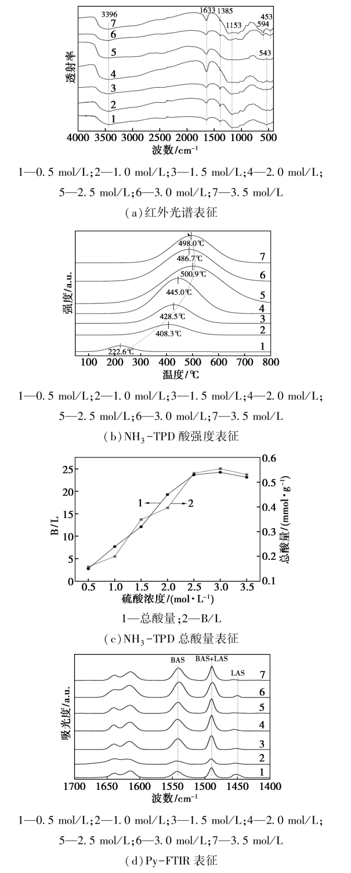 以硅胶为载体,通过共沉淀法制备了SnO2/SiO2复合固体酸催化剂,并经硫酸酸化调控其表面酸性质,用于山梨醇脱水制异山梨醇。系统研究了硫酸酸化条件(酸浓度、用量、温度和时间)对催化剂性能的影响,结合NH3-TPD、Py-FTIR等表征手段揭示了催化剂表面酸性质与催化性能的内在联系。结果表明,最佳酸化条件为2.5 mol/L硫酸、硫酸用量[v($\mathrm{SO}_{4}^{2-}$):m(Sn-Si)]5:1、60℃、酸化3 h,在此条件下130℃反应5 h,异山梨醇收率达75.7%。同时,通过原位FT-IR探讨了催化作用机制,分析表明反应中间产物在催化剂表面形成稳定吸附态。